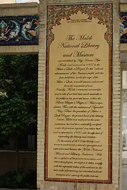 Sowohl die Bibliothek als auch das Museum wurden 1937 von Hossein Agha Malek gestiftet. Buch- und Kunstgegenstände befanden sich bis 1966 in dessen Wohnhaus. Dann wurden sie in einen neuen Bau in die Imam-Khomeini-Straße neben das Ministerium für auswärtige Angelegenheiten in die Innenstadt von Teheran überführt und deren Nutzungsmöglichkeiten erweitert. Malek spendete die Anlage Astana Quds Rezavi. Malek, ein bemerkenswerter Intellektueller der Jahrhundertwende im Iran, galt als bedeutender Kunstsammler. Ein neues Museumsgebäude wurde 1997 eröffnet.