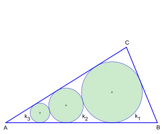 - Gegeben sei ein Dreieck, konstruiere drei Kreise darin so, dass jeder der Kreise tangential ist (das heißt, sie berühren einen Punkt) mit den anderen zwei und mit zwei Seiten des Dreiecks.