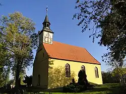 Die Dorfkirche, ein rechteckiger verputzter Ziegelbau, der westliche Dachturm aus Fachwerk, stammt aus dem Jahr 1757, der Kanzelaltar mit Schranken aus der Erbauungszeit, das Betpult aus der ersten Hälfte des 18. Jh. Von 1608 sind Kelch und Patene aus vergoldetem Silber, die beiden Eisenguß-Glocken von 1829.