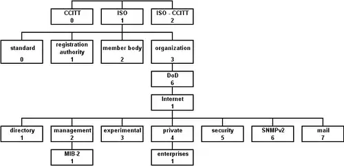 Die Managed Objects werden durch einen eindeutigen Object Identifier (kurz: OID) identifiziert. Dieser OID kann in zwei Formen dargestellt werden: als eine Zahlenkette (.1.3.6.1.4.1) oder durch eine ASCII-Repräsentation (.iso.org.dod.internet.private.enterprise). Diese beiden Formen können auch gemischt werden (private.1). Die OID beschreibt den Weg durch die hierarchisch aufgebaute MIB zum Managed Object.