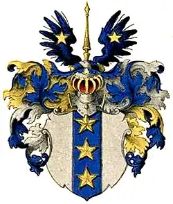 Das Wappen[10] zeigt einen blauen, mit drei fünfspitzigen goldenen Sternen, belegten senkrechten Balken im silbernen Wappenschild. Auf dem Helm eine goldene Pike zwischen einem blauen Flug, der auf beiden Seiten mit einem wiederholten Stern erscheint. Die Helmdecken sind blau und abwechselnd mit Gold und Silber gefüttert.[11]