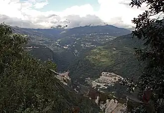 ![]() Bauarbeiten am Staudamm des Mangdechhu-Wasserkraftwerks im Jahr 2015; im Hintergrund Trongsa | ||
