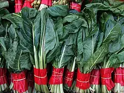 Der Mangold ergibt mit seinen langgestielten, bis 30 Zentimeter langen Blättern ein rein vom Aussehen her dem Spinat ähnliches Gemüse. Es gibt zahlreiche Sorten mit unterschiedlicher Blattfarbe (bleich, gelb, hell- bis dunkelgrün und dunkelrot), die Blätter können runzelig oder glatt sein. Es werden die Blätter und die Stiele verzehrt, nicht jedoch die Wurzeln. Mangold kann auch als Ersatz für Stängelkohl bzw. Rübstiel genommen werden.