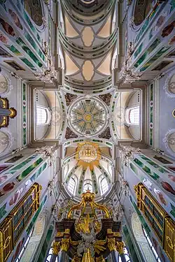 Der durch Stuckmarmorpilaster gegliederte Innenraum ist ganz in einem späten Barockstil gestaltet. Trotz der Weltkriegsschäden ist die Kirche auch heute noch reich an barocken Kunstwerken.