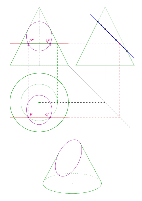 blau: Zylinder (1. Fläche), grün: Kegel (2. Fläche), rot: zur Konstruktion von P und Q verwandte Mantellinien, lila: Schnittkurve