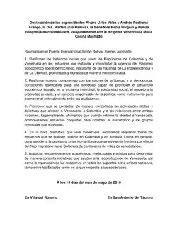 Machado bezeichnete die Regierung Venezuelas ab Mai 2016 als „Militärdiktatur“ sowie zusätzlich gegenüber der OAS als „mafiös“ und „grausam“.[12][13] Im Mai 2018 traf sie die beiden ehemaligen Präsidenten Kolumbiens Uribe und Pastrana auf der Grenzbrücke.[14]