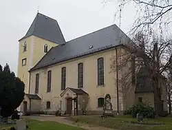 Die Existenz einer Pfarrkirche geht wahrscheinlich bis auf das Jahrhundert der Besiedlung zurück. Ältester Teil ist der in der Region mehrfach vorkommende querrechteckige frühgotische Westturm.[9] Das Kirchenschiff wurde 1770/71 als schlichte barocke Saalkirche als Ersatz für den zu klein gewordenen Vorgängerbau errichtet. Sehenswert sind auch die Ölgemälde ehemaliger Marbacher Pfarrer.[10]