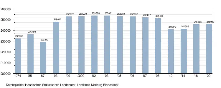 Die Anzahl der Einwohner mit Erstwohnsitz im neuen Landkreises Marburg-Biedenkopf lag 1974 bei seiner Gründung bei 232.632 und stieg anschließend auf über 250.000. Beim Zensus 2011 wurde die Anzahl um ungefähr 10.000 nach unten korrigiert, was in etwa der Korrektur der Einwohnerzahl der Stadt Marburg entsprach. Anschließend gab es bis 2018 eine leichte Bevölkerungszunahme um 1,8 %. Seitdem blieb die Einwohnerzahl nahezu konstant bei 246.000. Dies entspricht auch weitgehend der Prognose des Landes Hessens für die Bevölkerung im Landkreis im Jahre 2030.[12]