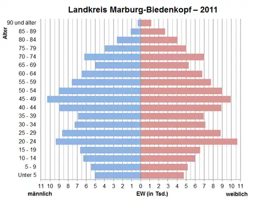 - ↑ Datenbank Zensus 2011, Kreis Marburg-Biedenkopf, Alter + Geschlecht ( des vom 22. September 2021 im Internet Archive) Info: Der Archivlink wurde automatisch eingesetzt und noch nicht geprüft. Bitte prüfe Original- und Archivlink gemäß Anleitung und entferne dann diesen Hinweis.