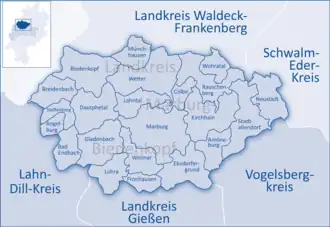 - ↑ Gesetz zur Neugliederung der Landkreise Biedenkopf und Marburg und der Stadt Marburg (Lahn) (GVBl. II 330-27) vom 12. März 1974. In: Der Hessische Minister des Innern (Hrsg.): Gesetz- und Verordnungsblatt für das Land Hessen. 1974 Nr. 9, S. 154, § 8 (Online beim Informationssystem des Hessischen Landtags [PDF; 3,0 MB]).