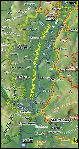 Ganz im Nordosten liegt randlich das Marburger Dorf Ronhausen. Von der Gemeinde Weimar liegen lediglich Nesselbrunn, Weiershausen und Allna deutlich außerhalb des Naturraums; Kehna liegt auf rund 210 m ü. NHN[8] an einer Randbucht im Westen, Oberweimar (206 m)[8] weiter nördlich und Stedebach (205 m)[8] weiter südlich liegen ebenfalls am Westrand. etwa mittig und unmittelbar westlich der Eisenbahntrasse liegen Niederweimar, Wenkbach und Niederwalgern. Im Osten, an der Lahn, liegen Argenstein, Wolfshausen und Roth, wobei Argenstein komplett rechts (westlich) und Wolfshausen komplett links des Flusses liegen.