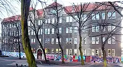 An der Marchlewskistraße (damals: Memeler Straße 24/25) wurde zu Beginn des 20. Jahrhunderts eine Gemeinde-Doppel-Schule (87., 98. und 257. Gemeindeschule, danach Handelsschule und 256. Volksschule) zusammen mit dem Wohnhaus für den Rektor („Lehrerwohnhaus“) nach Entwürfen von Hermann Blankenstein und Bernhard Mylius[60] erbaut. Die 87. und 98. Geindeschule zog 1908 in den Neubau Bromberger Straße (→ Datheschule) um, die 256. Gemeindeschule (kathol., Knaben- und Mädchen).[61] aus dem Mietshaus 68 zog hierher.[62] Das Schulgebäude auf Marchlewskistraße 44 (Zugang über 47) wurde kriegszerstört und existiert nicht mehr. Das erhaltene Rektorenwohnhaus (Nummer 45) ist ein dreigeschossiger mit gelben und roten Klinkern verblendeter fünfachsiger Mauerwerksbau. Die Fassade wird durch Zierfriese, rote Querstreifen und Gesimse aufgelockert und besitzt mittig ein leicht vorgebautes Portal.[63][64] Es wird nach Umbauten als Wohnhaus genutzt.[65] Das Grundstück der Schule wurde von der Gubener Straße her mit 13–13d bebaut.