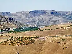 Die Zivink Uvala mit einem Durchmesser von 2 km und einer Tiefe von 100 m im Süden der Siedlung Midyat-Sanköy weist solche charakteristischen Merkmale auf. Getreideanbau erfolgt dort auf Terra-Rossa-Böden, die an der Basis der Uvala gebildet werden. Nördlich dieser Uvala befindet sich eine weitere Uvala mit einem Durchmesser von 200 Metern, die in gleicher Weise verwendet wird. Wo entsprechende Flachgebiete als Ackerland nicht ausreichend zur Verfügung stehen, sind oft die Talhänge dicht bei dicht terrassiert und in vielerlei Hinsicht landwirtschaftlich genutzt. Die Weiler Selvik und Şekrin des Dorfes Efşik bei Nusaybin liegen an den Hängen einer Doline. Die städtische Siedlung Merdin (nicht: Mardin) befindet sich im Zentrum der Yeşilli-Karstsenke, und die Kızıltepe-Ebene im Süden verfügt über reichliche Wasserressourcen aus Karstquellen. Auch wenn man an Schwierigkeiten hinsichtlich der Wasserversorgung in diesen Karstgebieten denkt, eignet sich die dicke und massive Struktur des Kalkgesimses gut für den Bau von Zisternen, die den Wasserbedarf über lange Zeit decken. Auf dem weiten Karstplateau gibt es subsequente (den Gesteinsschichten folgende) Senken, Schluchten, abflusslose Täler, Hums, Überhänge, Schichtkanten und Hügelketten je nach dem Skelett der Strukturmorphologie.[25] Darüber hinaus treten Riesenkarren auf und Höhlen sowohl an den Talhängen als auch in unmittelbarer Nähe der Täler. Außerdem wird die Karstentwicklung durch die Einschnitte der Hauptflusstäler in die Kalksteine gesteuert. Wenn sich der Taleinschnitt unter den Boden des Karstblocks vertieft, werden unterirdische Karstwasserströme leicht angeschnitten und damit Quellaustritte geöffnet, wichtige Quellen, die entweder über oder in den Flussbetten oder entlang von Verwerfungen vorkommen. Zudem sind ausgedehnte Oberflächenmerkmale zu beobachten, die über das Karbonat-Plateau verstreut sind, darunter neben Dolinen, Uvalas häufig auch einstürzende flache Höhlen sowie die Entwicklung eines dichten Netzes aus blinden und trockenen Rinnen von bis ca. 15 m Tiefe.[29]