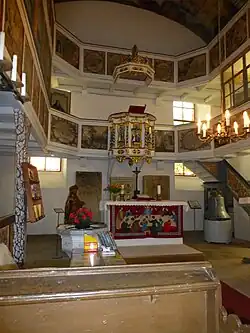 Der Innenraum hat umlaufende doppelstöckige Emporen und ist mit einem hölzernen Tonnengewölbe überspannt. Die Patronatsloge ist durch Glasfenster geschlossen. Die Ausmalung von Decke und Brüstungen der Emporen erfolgte 1775 durch Johann Friedrich Ender. Dargestellt sind im Wechsel szenische Bilder und Texte. Das untere Emporengeschoss behandelt das Neue Testament, das obere das Alte Testament. Vor der Ostempore steht ein Kanzelaltar. Links daneben steht eine lebensgroße Skulptur der heiligen Elisabeth. Der aus der Vorgängerkirche stammende Taufstein ist aus dem 16. Jahrhundert, auf der Kuppa befindet sich ein Ornament. Die barocke Kanzel mit Holzfiguren befindet sich mitten über dem Altar in der unteren Empore, sie entstand 1718. An der Tür zur Hansteinschen Patronatsloge befindet sich ein Bild von Martin Luther. Das Taufbecken ist etwa 400 Jahre alt und stammt aus der Vorgängerkirche. Die Orgel mit 11 Registern, verteilt auf 2 Manuale und Pedal, wurde 1928 im alten Orgelprospekt von Conrad Euler gebaut.[2]