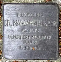 - ↑ Opfer der Verfolgung der Juden unter der nationalsozialistischen Gewaltherrschaft in Deutschland 1933–1945. Band 2. Bundesarchiv 2006. ISBN 3-891-92137-3. S. 1595; online: Gedenkbuch des Bundesarchivs Kahn, Margarete Margarethe