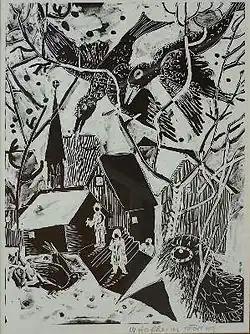 1966 wurde die Malerin bei Besuchen im Linden-Museum Stuttgart auf exotische Masken aufmerksam. Vor Ort angefertigte Zeichnungen kolorierte sie später und gestaltete sie mit gespritzter Farbe oder Tusche.[24] In den folgenden Jahren tauchen Masken immer wieder in ihrem Werk auf; entweder als übergroße Strukturbilder oder in Bildern, die Beziehungen zwischen Menschen zum Thema haben.