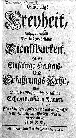 - Glückselige Freyheit, Entgegen gestellt Der beschwerlichen Dienstbarkeit. Oder: Einfältige Hertzens- Und Erfahrungs-Lehr, Einer Durch die Wahrheit frey gemachten Schweitzerischen Frauen. Neuwied 1740 und Bern 1743. (Digitalisat).[6]