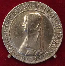 Inzwischen wurde die Markgrafschaft zwischen den Gebietsansprüchen von Savoyen und Frankreich bedrängt. Marguerite verließ sich auf den König von Frankreich, ihren Verwandten, und bot Franz I. bei dessen Besuch in Mailand 1515 persönlich ein politisches Bündnis und militärische Unterstützung an. Auch nach der Volljährigkeit ihres Sohnes Michael Anton, der sich wenig für die Regierungsgeschäfte interessierte, behielt Marguerite ihre Macht bei. 1516 wurde sogar eine Münze in Carmagnola geprägt, auf der sie allein dargestellt wurde, zuvor war sie stets gemeinsam mit ihrem Mann dargestellt worden. Das Bild ist umgeben mit der Schrift „Margherita De Fuxo, Marchesa di Saluzzo, Tutrix e Curatrix“.[7]