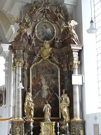 Von Anfang an waren für die Pfarrkirche Mariä Geburt fünf Altäre vorgesehen, jedoch wurden diese erst nach und nach realisiert. Der stattliche Hochaltar wurde 1734 vom bayerischen Kurfürsten Karl Albrecht gestiftet, worauf sein von Putten gehaltenes Wappen über dem Altarblatt hinweist. Da auch kaiserliche Embleme zu finden sind, dürfte der Wappenschild frühestens 1742 entstanden sein. Der Adlige übernahm lediglich die Kosten für die Kistlerarbeiten an dem Altar, die wahrscheinlich von Veit Madersbacher aus Erding ausgeführt wurden. Die Fassmalerarbeiten wurden dagegen von der Pfarrei bezahlt und von dem ortsansässigen Maler Franz Albert Aiglstorffer ausgeführt. Unbekannt ist jedoch der Schöpfer der zahlreichen Schnitzwerke. Das große Altarblatt, das von dem Ebersberger Maler Anton Rick im Jahr 1884 als Kopie nach Raffael angefertigt wurde, stellt die Krönung Mariens durch die Heilige Dreifaltigkeit dar. Darunter sind die Apostel zu sehen, die sich um das leere Grab versammelt haben, aus dem jetzt Rosen und Lilien sprießen.[5]
