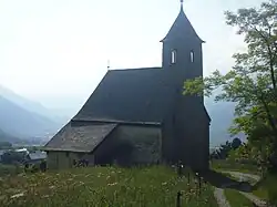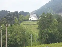 Die kleine Kirche Mariä Heimsuchung liegt auf einer Bergrückenterrasse des rechtsseitigen Gadriahangs in der Fraktion Allitz in Laas (Südtirol).