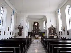 Im Inneren der Kirche gestalteten Holzbildhauer Johann Georg Lang (Oberammergau) und Holzschnitzer Bur (Dieblingen) 1957 den Hochaltar im Chor, mit Barock-Figuren der Muttergottes und des Herzens Jesu, flankiert von ebenfalls aus dem Barock stammenden Engeln. Von 1957 stammen außerdem der Marienaltar und die Kanzel seitlich des Altarraumes, die in den Jahren 2001 bis 2003, zusammen mit dem Hochaltar einer Restaurierung unterzogen wurden.