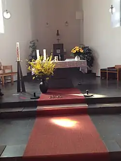 Die Kirche besitzt keine Turmuhr und keinen Chorraum, jedoch gehören zur Kirche auch ein Gemeindesaal und eine Küche.