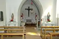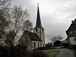 Der Kirchturm steht als Chorturm im Osten. Der Chorraum im Untergeschoss besitzt ein Kreuzrippengewölbe. Das Langhaus mit drei Fensterachsen ist flachgedeckt. Die Fenster der Kirche sind spitzbogig. Taufstein und Sakramentshäuschen in der Kirche stammen aus der Bauzeit. Später erhielt die Kirche eine neugotische Einrichtung. Im Jahr 1958 wurde sie auf Veranlassung des Würzburger Dombaumeisters Hans Schädel aus der Kirche entfernt. Teile davon kehrten Ende der 1980er Jahre auf neuen Seitenaltären in die Kirche zurück. Weiterhin enthält die Kirche über dem Taufstein ein Bronzebild, das Liborius Wagner darstellt. Über dem Altar ist ein hölzernes Kreuz mit bronzenem Korpus angebracht. Die Kirchenfenster wurden aus Anlass der Seligsprechung von Liborius Wagner gestaltet.