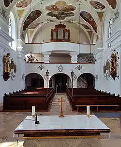 Der Hochaltar stammt aus dem 17. Jahrhundert, das Altarbild wurde vom Neustädter Kirchenmaler Johann Albrecht gefertigt. Rechts auf dem Altar befindet sich eine Statue des heiligen Johannes des Täufers und links eine des heiligen Johannes Nepomuk. An beiden Seiten des Altars sind zwei Epitaphien, Denkmäler die an das fränkische Adelsgeschlecht der Heideck erinnern, angebracht. Das Eine zeigt den Ritter Georg von Heideck in einem mittelalterlichen Harnisch mit Schwert und Streitkolben, das Andere seine Gemahlin Felicitas in einem zeitgenössischen Gewand. Der Taufstein ist einer der ältesten Gegenstände in der Kirche. Er stammt aus dem 12. Jahrhundert und trägt Figuren der vier Evangelisten mit ihren Symbolen.[3] Über dem Stein liegt das achteckige Taufbecken aus grauem Sandstein, das mit zahlreichen Reliefs verziert ist. Die Orgel stammt aus dem Jahr 1888 und ist ein Werk von Ludwig Edenhofer, von dem nur noch wenige Instrumente erhalten sind.[4] Sie verfügt über 10 Register auf einem Manual und Pedal sowie mechanische Kegelladen.[5]