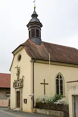 Das Gotteshaus ist nicht geostet, sondern wurde nach Norden ausgerichtet. Das Langhaus weist zwei Fensterachsen auf und schließt mit einem Walmdach ab. An der Südseite erhielt die Kirche ein Portal aus der aufgelösten Kitzinger Klosterkirche. Es zeigt die Allegorien von Glaube, Liebe und Hoffnung, die als Engelsfiguren mit unterschiedlichen Attributen dargestellt sind. Zentral war ursprüngliche eine Sandsteinmadonna angebracht, heute wurde es von einem Relief der Krönung Mariens aus dem 20. Jahrhundert ersetzt.[3]