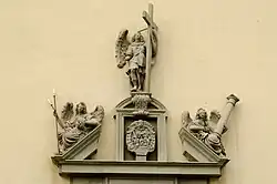 Die Kanzel, ebenfalls aus Kitzingen herangeschafft, stammt aus der Zeit um 1670 und weist auf dem Schalldeckel eine Figur des Messias auf, der eine Schlange zertritt. Der Kanzelkorpus ist mit Säulchen, Blendnischen und Muschelwerk verziert. Im Jahr 1674 wurde ein Gemälde vom Maler Oswald Onghers geschaffen, das die Rosenkranzübergabe an Dominikus und Katharina von Siena zeigt. Ursprünglich hing es in der katholischen Johanneskirche in Kitzingen.[3]
