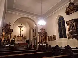 Ein kleiner Dachreiter wurde auf der Südseite aufgebaut. Im Inneren wurde das Langhaus mit einer Flachdecke errichtet. Der Chor wurde, ebenso wie die Sakristei im Jahr 1825 an die Kirche angebaut. Er schließt mit einem Spiegelgewölbe ab.