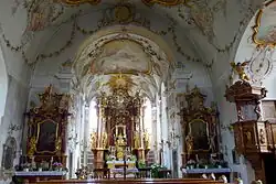 Das einschiffige Langhaus mündet im Osten in einen eingezogenen, dreijochigen, um eine Stufe erhöhten, dreiseitig geschlossenen Chor mit Tonnengewölbe und Stichkappen. An der Nord- und Südseite des Chors öffnet sich je ein Oratorium mit prächtigen, holzgeschnitzten Gittern. Flache Pilaster mit Kompositkapitellen und Gebälkstücken gliedern die Chorwände.