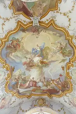 Die Deckenfresken von Chor und Langhaus werden von profilierten Stuckrahmen eingefasst. Stuckkartuschen umrahmen die kleineren Fresken mit den Darstellungen der Tugenden Marias, die durch Blütengirlanden miteinander verbunden sind. Über dem Chorbogen ist in einer Muschelwerkkartusche, von Engelsputten umgeben, das Wappen der Grafen von Oettingen, angebracht, den früheren Grundherren des Ortes.