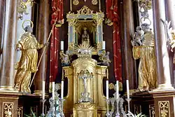 - Der Hochaltar ist wie die Kanzel eine Arbeit von Franz Henle und Johann Georg Bschorer und wurde 1725 aufgestellt. In der Mitte steht das Gnadenbild der thronenden Muttergottes, eine Kopie aus der zweiten Hälfte des 17. Jahrhunderts, die nach der ursprünglichen Skulptur aus der Zeit um 1400 angefertigt wurde. Seitlich am Altar stehen links die lebensgroßen Figuren des Karl Borromäus und die hl. Katharina und rechts Antonius von Padua und die hl. Barbara.