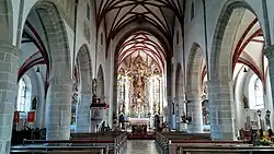 Die drei Fresken an der Nordwand stammen aus der zweiten Hälfte des 15. Jahrhunderts.[10] Sie wurden 1912 aufgedeckt, nachdem sie in kalvinistischer Zeit übertüncht worden waren. In einem Fresko über der zweiten Arkade ist das Allianzwappen der Thüringer und Chamerauer erhalten, das Hauptfresko über der Mittelarkade zeigt die Legende der drei lebenden und der drei toten Könige. Die Inschrift auf den angedeuteten Bändern lautet vermutlich Was ihr seid, sind wir gewesen, was wir sind, werdet ihr sein.[11] Der Raum ist 46 Meter lang, 21 Meter breit und 13,4 Meter hoch. Er ist durch zwei Säulenreihen als dreischiffige Halle gegliedert.[12] Sowohl in der Querachse als auch in der Länge wechselt eine achteckige mit einer runden Säule ab. Von den Kapitellen im Mittelschiff erheben sich schlanke Dienste zu einem hohen Rippengewölbe, die Rippen sind aus gebranntem Ton hergestellt. Der Innenraum wird durch große, dreibahnige Fenster belichtet. Die Öffnungen im Obergaden wirken als reine Luftschächte und münden in den Seitenschiffen in den Dachstuhl.[12] Der eingezogene 5/8 Chor ist vom Langhaus durch einen leicht zulaufenden, profilierten Gewölbebogen getrennt. Das Presbyterium weist in der Längsachse zum Langhaus einen leichten Knick nach rechts auf. Das soll nach verbreiteter Deutung das geneigte Haupt des gekreuzigten Christus versinnbildlichen. Der Chor ist im Gegensatz zum Langhaus durch die drei großen Fenster lichtdurchflutet.[13] Eine gründliche Gesamtrenovierung wurde 1972 vorgenommen.[14]