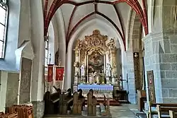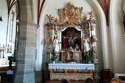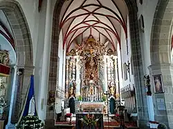 Der barocke Hochaltar wurde vermutlich von Fidelis Ittelsberger aus Cham gebaut, der auch am Ausbau etlicher anderer Kirchen in der Region beteiligt war.[15] Der Altar ist ein hochbarocker Kulissenaltar. Insgesamt 26 Putten und Engel begleiten das rückwärtige Ölgemälde. Als Altarwächter fungieren Figuren der Apostel Petrus und Paulus.