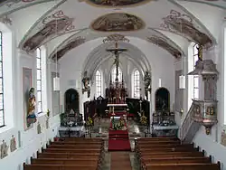 In der Kirche befindet sich ein Gemälde des heiligen Franziskus aus dem 18. Jahrhundert. Die weiteren Ölbilder unterhalb der Empore malte Theodor Baierl 1908. Sie zeigen die heilige Therese von Avila und Franz von Borja.