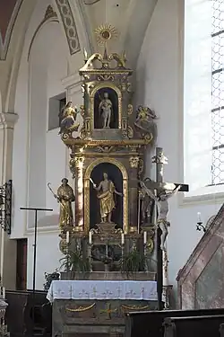 - Am südlichen Seitenaltar stehen die Figuren des heiligen Leonhard, des heiligen Sebastian und des heiligen Rochus von Montpellier.
