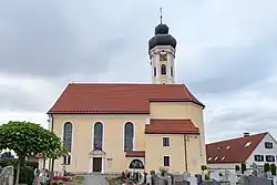Die Saalkirche wurde 1721/23 errichtet. Sie besteht aus einem Langhaus, einem eingezogenen, dreiseitig geschlossenen Chor im Osten und der Sakristei an der Südwand des Chors. Der Chorflankenturm auf quadratischem Grundriss an der Nordwand wurde 1769/73 nach Plänen von Johann Georg Hitzelberger neu gebaut wurde. Seine unteren vier Geschosse haben Lisenen an den Ecken. Sein achteckiges Geschoss, das den Glockenstuhl und die Turmuhr beherbergt, ist mit Pilastern an den Ecken versehen. Darauf sitzt eine Welsche Haube.