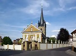 1762 wurden die beiden Seitenaltäre, die bei dem Umbau von 1706 aus der alten Kirche übernommen worden waren, durch neue Altäre im Stil des Rokoko ersetzt.[11] 1772 wurde der Kirchhof erweitert und mit einer neuen Mauer umgeben, bei der die Steine der bisherigen Kirchhofmauer wiederverwendet wurden.[12] Auf zwölf die Mauer gliedernden Pfeilern wurden Statuen von Engeln und Heiligen aufgestellt, die der Bildhauer Ferdinand Dietz für diesen Zweck schuf.[13] 1796 wurde der 1710 aufgestellte Hochaltar durch einen neuen Rokokoaltar ersetzt, der bereits klassizistische Stilelemente enthielt. Wieder bildete das Hauptmotiv eine Figurengruppe der Krönung Mariens.[14] Dieser Altar wurde 1870 für baufällig erklärt und 1874 durch einen Altar im neoromanischen Stil ersetzt. Statt durch eine Figurengruppe wurde die Krönung Mariens nun in einem gemalten Altarbild dargestellt.[15]