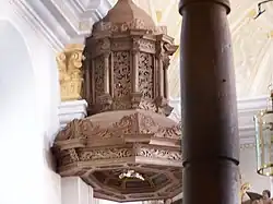 Der polygonale Korpus, der mit glatten und gewundenen Säulchen verziert ist, weist reiches Akanthusornament und Schnitzereien der guten und bösen Geister auf. Die guten Geister sind in Form von Engelsköpfchen dargestellt, die bösen Geister, die Worte des Verderbens unter die Menschen aussäen, in Gestalt von Fratzen, die nun dienen, in diesem Fall Säulen tragen müssen.[3]