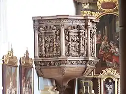 - An den Scheitelflächen der Gewölbe sind Kreis- und Vierpassformen, die mit Rosettenblüten verziert sind, sowie zahlreiche Engelsköpfchen zu finden.