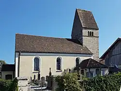 Die im Kern romanische Saalkirche wurde um 1200 erbaut. Sie besteht aus dem 1768 vergrößerten und barock umgestalteten Langhaus, dem Chorturm im Osten, der Sakristei an der Südwand des Langhauses und einem Vorbau an der Fassade im Westen mit dem Portal. Im obersten Geschoss des Turms steht hinter den als Triforien gestalteten Klangarkaden der Glockenstuhl.