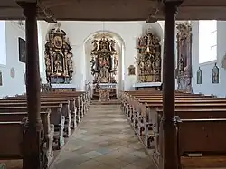 Der Innenraum des Langhauses ist mit einem Stichkappengewölbe überspannt. In der Deckenmalerei von 1789 ist die Aufnahme Mariens in den Himmel dargestellt. Der um 1660/70 gebaute Hochaltar wird von den Skulpturen des heiligen Joachim und der heiligen Anna flankiert. Im Altarauszug ist Josef von Nazaret dargestellt. Der Mittelteil des Altars zeigt in einem geschnitzten Relief Mariä Krönung durch Jesus und Gottvater.