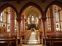 Der Kirchenraum wird durch sechs Bündelpfeilerpaare in ein breiteres, höheres Mittelschiff und zwei Seitenschiffe geteilt. Die Pfeiler bestehen aus einem gemauerten und verputzten Vierkant auf Basen aus rotem Sandstein mit Halbsäulenvorlagen aus Sandstein an allen vier Seiten. Schaftring und Kapitelle sind aus rotem Sandstein gearbeitet. Der Vierkant ist sandsteinfarbig gefasst. Die Außenwände sind durch gemauerte verputzte Halbsäulen zwischen den Fenstern gegliedert. Der Putz ist sandstein-farbig gestrichen. Die Basen und Kapitelle sind aus Sandstein. Die drei Schiffe werden durch Kreuzrippengewölbe abgeschlossen. Die Gurtbögen und Rippen sind aus Backstein gemauert und verputzt.[1]