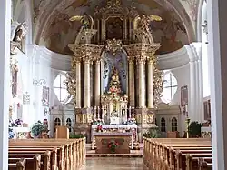 Der Kirchenraum wird dominiert von dem barocken Hochaltar, einem sechssäuligen Aufbau, der 1710 von dem Schreiner Johann Meier aus Kumpfmühl gefertigt und im Jahr darauf von dem Maler Josef Georg Aprill aus Stadtamhof gefasst wurde. Oberhalb des hoch aufbauenden Tabernakels befindet sich in einer Rundbogennische auf einem eigenen Sockel das spätgotische Gnadenbild aus der Zeit um 1470. Es handelt sich dabei um eine Figur der Mondsichelmadonna mit Jesuskind. Dieses wird durch die beiden Säulentripel gerahmt, die segmentbogige Gesimsstücke mit Engelsfiguren tragen. Zwischen diesen ist das von Johann Gebhard, dem Vater Otto Gebhards, gemalte Auszugsbild zu sehen. Es stellt Gott Vater über der blauen Universumskugel mit der Heilig-Geist-Taube und Putten, die das Kreuz Christi tragen, dar. Die beiden als Pendants ausgeführten Seitenaltäre befinden sich an der nördlichen und südlichen Innenwand etwa am Übergang zwischen Langhaus und Chor. Sie dürften wie der Hochaltar von Johann Meier gefertigt und von Josef Georg Aprill gefasst worden sein. Der linke (nördliche) Seitenaltar enthält einen Reliquienschrein mit Gebeinen des Märtyrers St. Gratus, darüber das Altarblatt mit einer Darstellung des heiligen Apostels Thomas und das Auszugsbild der heiligen Anna mit der jungen Maria. Der rechte (südliche) Seitenaltar zeigt einen Reliquienschrein des Märtyrers St. Pazificus, darüber ein eindrucksvolles Gemälde des heiligen Barbara im Nazarenerstil und im Auszug den heiligen Josef mit der Lilie der Reinheit. Das letztgenannte Bild könnte ebenfalls von Johann Gebhard stammen. Alle drei Altarantependien enthalten schöne Bandelwerkschnitzereien aus der Zeit um 1730.[1][2][4]