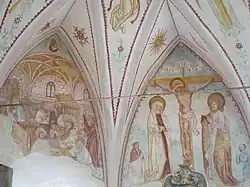 Bei der Renovierung 1960–65 wurden Fresken im Chor aufgedeckt, die aus der Zeit um 1465 stammen. Auf ihnen sind eine Kreuzigungsgruppe, der Marientod und der Pantokrator dargestellt. Die Kirchenausstattung erfolgte weitgehend um 1660. Das Altarretabel des Hochaltars wurde mit einem Marienbildnis bemalt. An den Seitenwänden des Langhauses hängen im rückwärtigen Bereich die vierzehn Kreuzwegstationen.