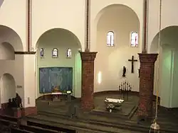 Nach dem Wiederaufbau blieb die Innenausstattung zunächst provisorisch. Ab 1968 erfolgte die Neugestaltung nach den Vorgaben der Liturgiereform des Zweiten Vatikanischen Konzils durch den Berliner Architekten Georg Schönfeld. Der neue blockhafte Altar aus Anröchter Dolomit wurde zum Zentralbau vorgezogen; er wurde gestaltet von Paul Brandenburg und am 17. Mai 1969 geweiht. Ambo und Priestersitz wurden gleichzeitig in entsprechender Gestaltung hinzugefügt und durch einen siebenarmigen Leuchter in Bronze ergänzt. Die bronzene Kreuzigungsgruppe in der Mittelapsis ist ein Neuguss der im Krieg zerstörten Figuren von Josef Limburg, die zum früheren Hochaltar gehörten. Da die Gussformen noch existierten, konnten sie neu gegossen und in die Gestaltung einbezogen werden. Die linke Seitenapsis nahm einen neuen Tabernakel mit vergoldeter Kupferverkleidung, gestaltet von Georg Schlüter, auf, der in seiner Form der Kuppelgestalt der Kirche nachempfunden ist. In der rechten Seitenapsis wurde der alte Taufstein von 1910 mit der Widmung Stiftung Stadt Spandau 1910 aufgestellt. Hinter Tabernakel und Taufstein füllen zwei abstrakte „Meditationsbilder“ die ansonsten monochromen weißen Wände. Diese Bilder stammen von dem Künstler Gerhard Köhler (* 5. September 1923; † 23. Januar 1974) und sind in Seccomalerei ausgeführt. Das Bild hinter dem Tabernakel trägt den Titel Cherubim, das auf der Rückwand des Taufsteins Durchzug durch das Rote Meer (Exodus 14,21-31 ).