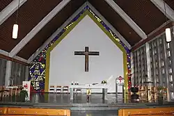 Ein Balkenkreuz nimmt die Stirnwand der Kirche ein. Nach Entwürfen von Josef Jost entstanden 1960 die farbigen Betongläser.