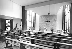 Ambo, Altartisch und Taufstein sind in ähnlichen modernen Formen wie das gesamte Gebäude gestaltet. Sie befinden sich auf einer zweistufigen Estrade vor einem großflächigen Reliefwandbild aus Naturstein mit einem davor angebrachten Kruzifix. Die Decke im Chor ist vom Kirchenschiff bis zur Altarwand abgeschrägt, was den Eindruck einer Theaterbühne verstärkt.